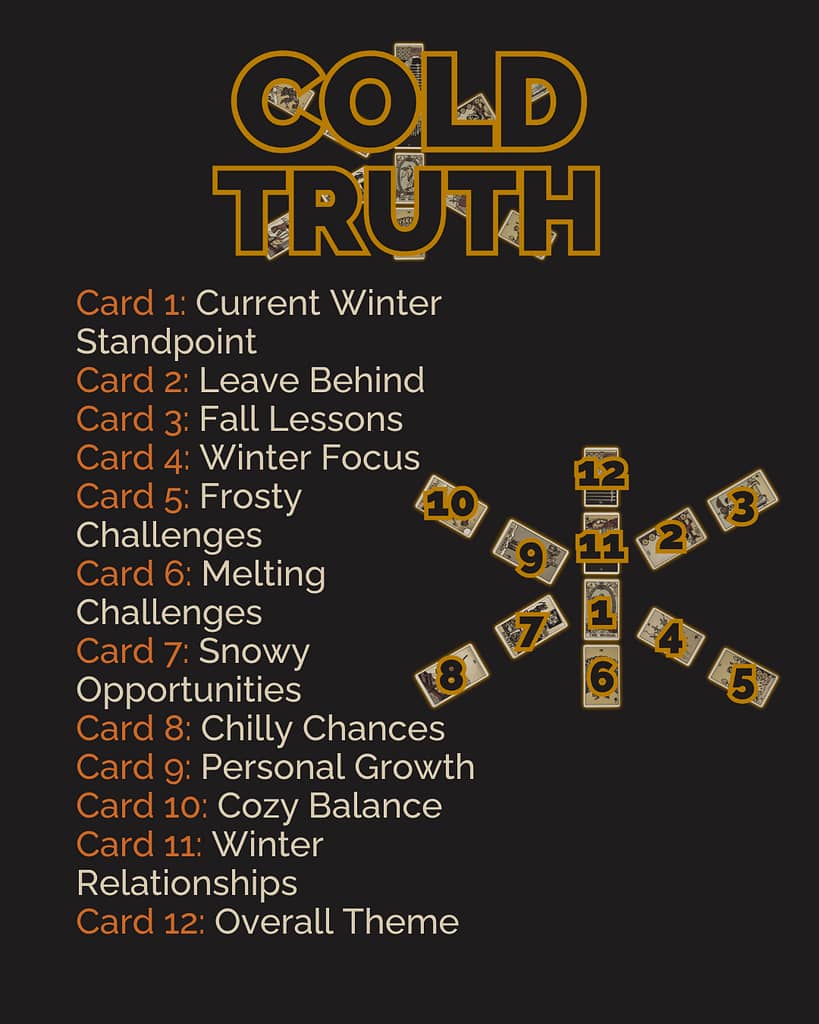 Winter is a time for retreat and reflection. The Cold Truth Spread aligns with this season’s energy, helping you assess the lessons, challenges, and triumphs of the past year. By taking a closer look at where you’ve been, this spread provides clarity on what to release and how to embrace the opportunities ahead. Whether you’ve faced a tough year or celebrated milestones, this spread offers an honest and compassionate lens for self-discovery.