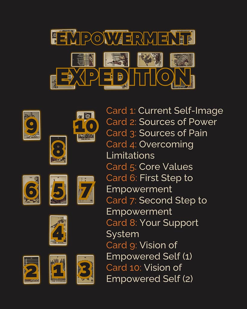 - Empowerment Expedition Spread – A spread to reclaim your inner strength and set goals for the future.