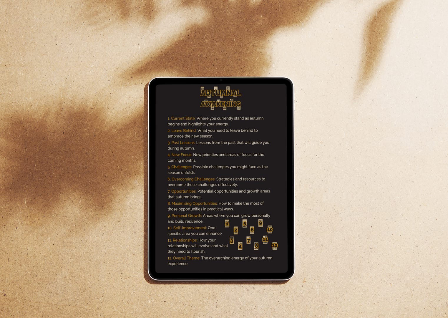 Most seasonal content treats autumn like a Pinterest board. This spread doesn't. Twelve positions covering where you're starting the season, what to leave behind, what summer was teaching you, where to focus now, the challenges, how to meet them, the opportunities, how to take them, where you can grow, what to push yourself on, how your relationships are shifting, and the overall theme of your autumn. The Autumnal Awakening tarot spread workbook gives you somewhere to sit with each card without rushing past what summer left behind. One page per position, a real prompt for each, and an action page for the next three months.