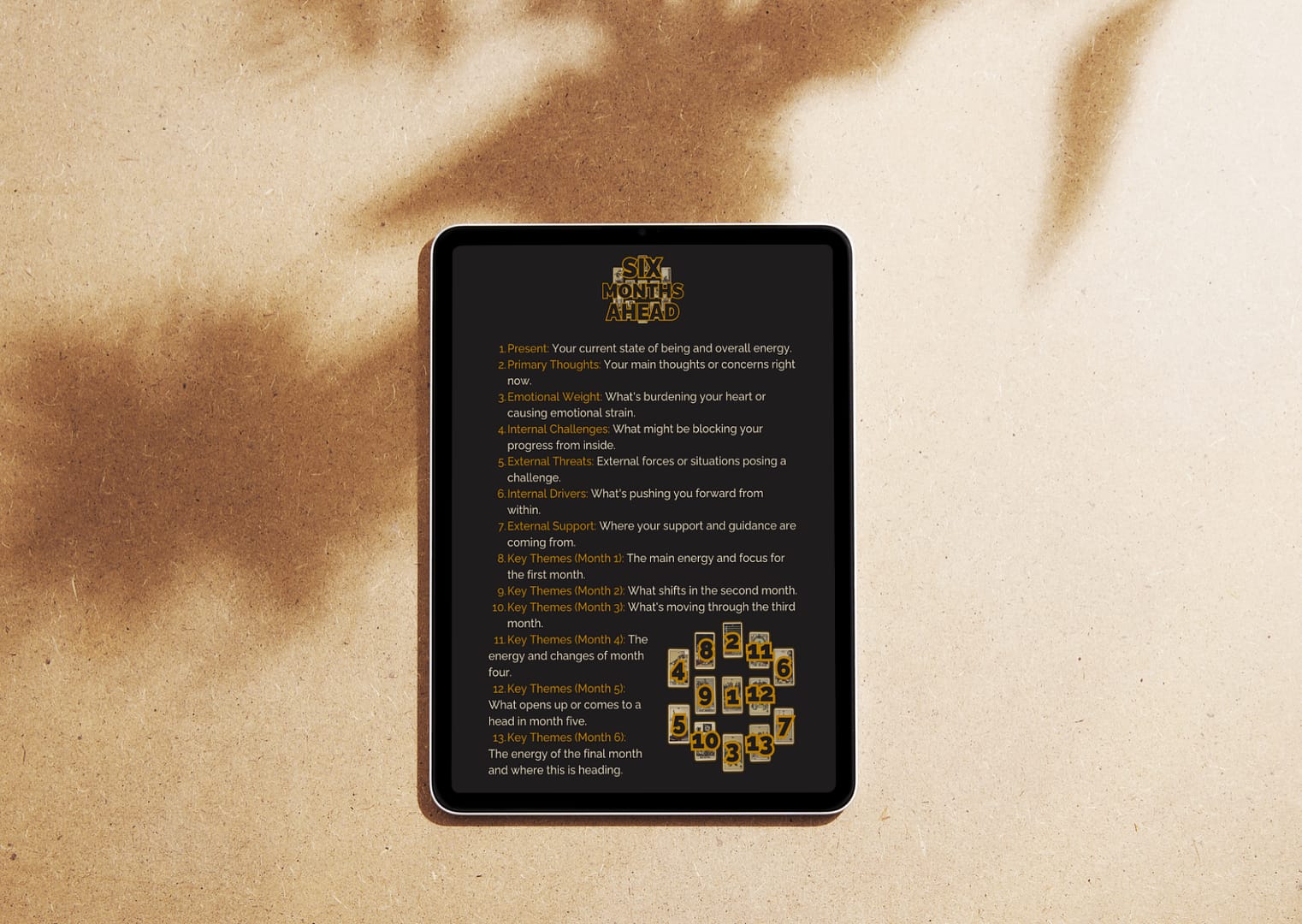 Lay all thirteen cards out before you start writing. Work through the seven foundation cards first, one page each, then move through the monthly cards in order. Fill it in on your device or print it out. Come back at three months and six months to close the loop on the reading.