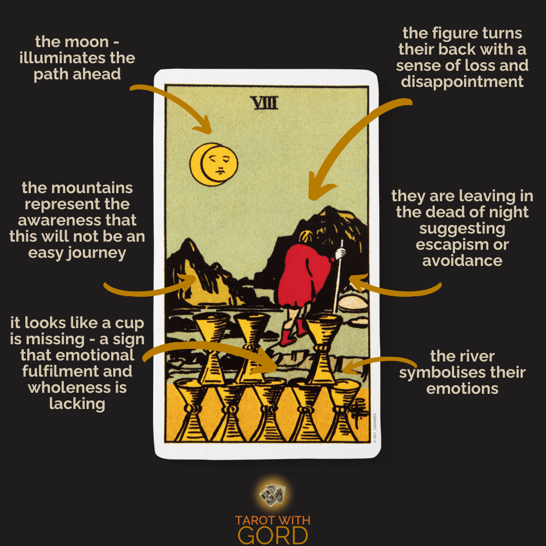 The Eight of Cups symbolises the courage to move on from unfulfilling circumstances. In the Rider-Waite-Smith image, a figure walks away under the moon, leaving eight neatly stacked cups behind. It highlights the decision to seek greater emotional fulfilment even if it means going alone.