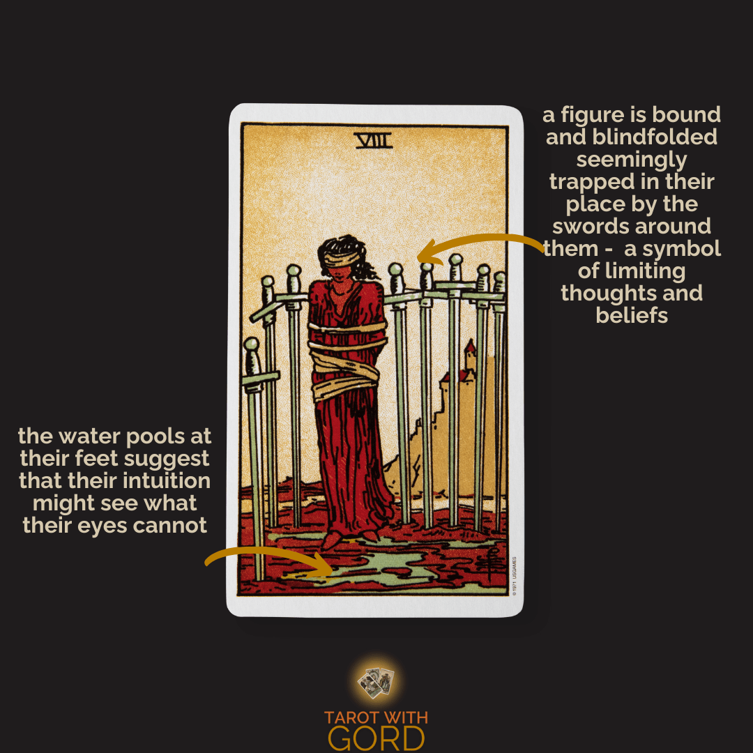 Eight of Swords points to feeling trapped, overwhelmed by your thoughts, and unable to see a way forward. The card urges you to recognise that the bondage is often self‑imposed. Freedom arrives when you challenge limiting beliefs and trust that your intuition will guide you out.