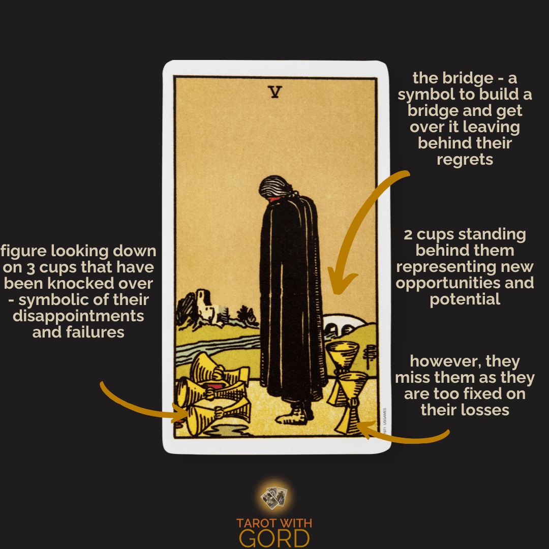 The weight of what went wrong. The Five of Cups represents grief, disappointment, and the tendency to fixate on loss rather than noticing what still remains. The pain is real and the sadness is valid. But the narrow focus on what's been lost can obscure the good that's still present. Recovery begins when your attention starts to shift.