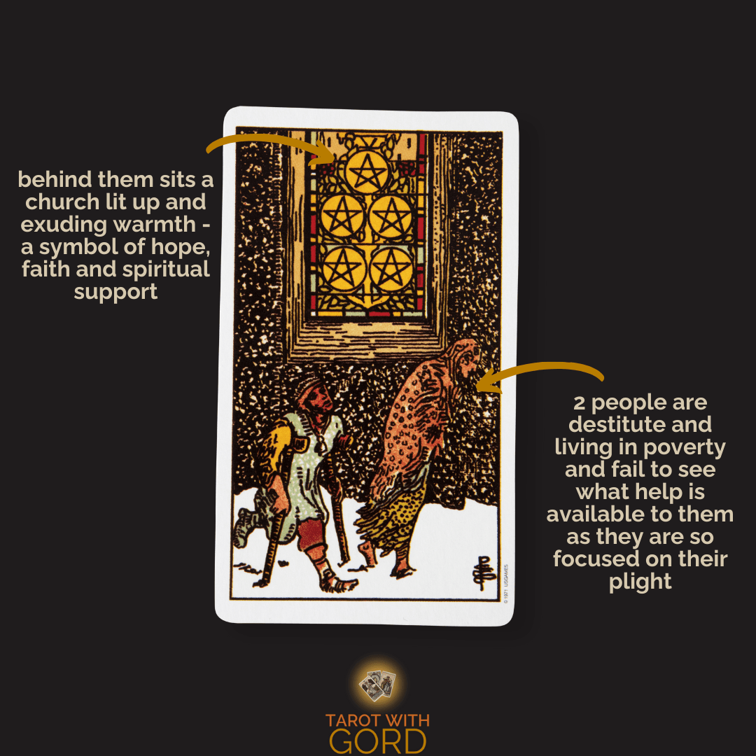 The stained-glass window with its five pentacles radiates light and warmth, representing help, abundance, or community that exists but isn’t being accessed. Whether the figures can’t enter, won’t enter, or don’t realise they could enter is left deliberately ambiguous. That ambiguity is the heart of the card.