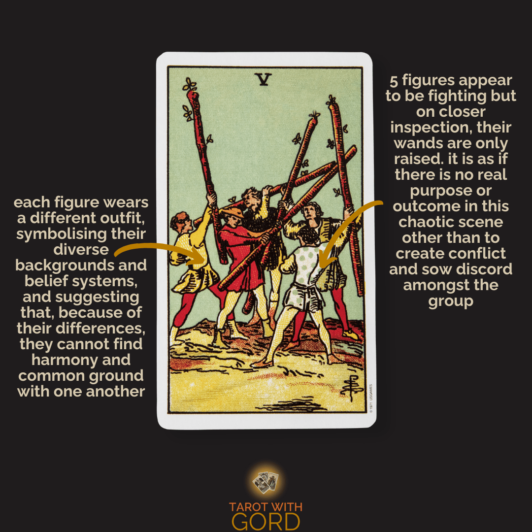 In the Rider-Waite-Smith Five of Wands, five figures brandish long wands, appearing to clash and struggle with one another. Their stances are chaotic, each person seemingly fighting independently rather than in coordinated battle. The scene feels disorganised and energetic rather than genuinely violent.