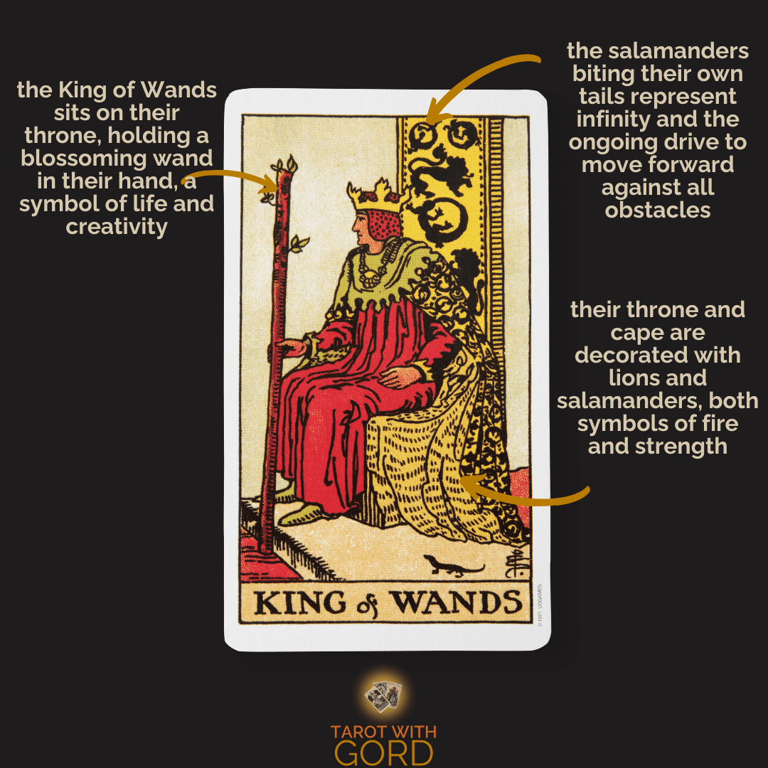 The King of Wands symbolises leadership, vision and action. On the Rider-Waite-Smith card, he sits on a throne with lions and salamanders, holding a blossoming wand. The salamanders, some eating their tails, suggest transformation and endless creative energy. His symbolism urges you to act boldly and inspire others.