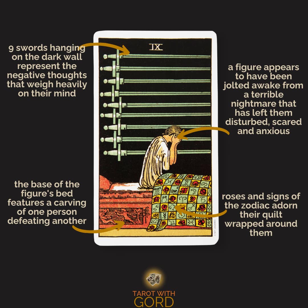 The Nine of Swords symbolises anguish, guilt and obsessive thinking. In the Rider-Waite-Smith image, a person sits up in bed with nine swords on the wall, illustrating sleepless nights and regret. The carved bed shows roses and zodiac signs, hinting that spiritual context can alleviate mental suffering.