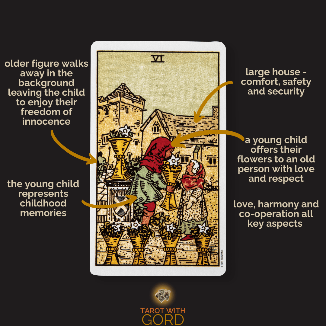 In some decks the Six of Cups is called Pleasure or Nostalgia. In other traditions, it may be labelled as Six Chalices. Regardless of title, it carries themes of past experiences, inner child work and reconnecting with joy. The underlying message remains the same.