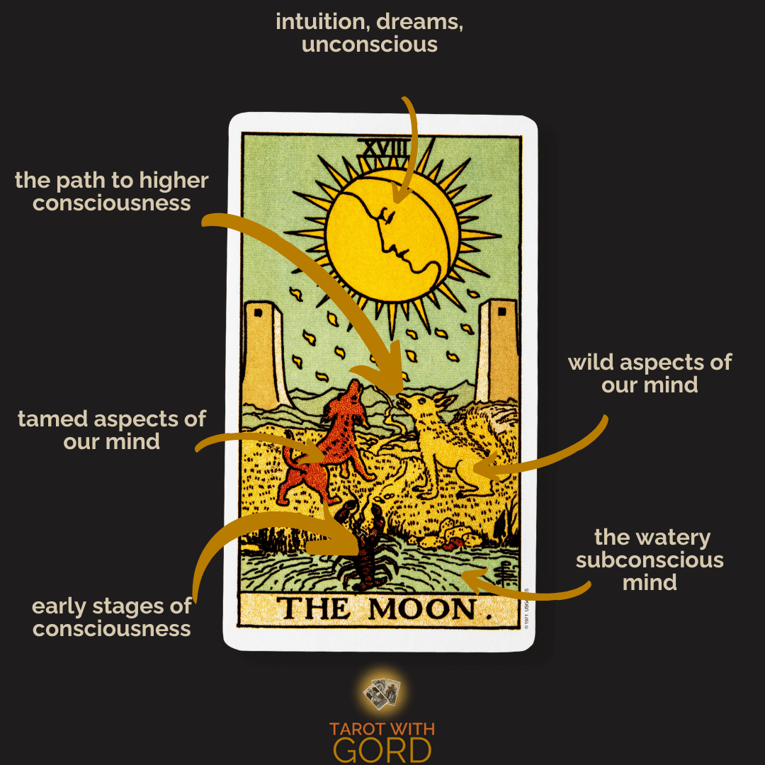 In the Rider-Waite-Smith tarot, a full moon hangs in the night sky between two towers, with a face gazing down in profile. A narrow path leads from a pool of water through the towers and into distant mountains. A crayfish emerges from the pool whilst a dog and a wolf howl at the moon from opposite sides of the path. Pamela Colman Smith’s artwork creates an atmosphere of unease, mystery, and things not being quite what they seem.