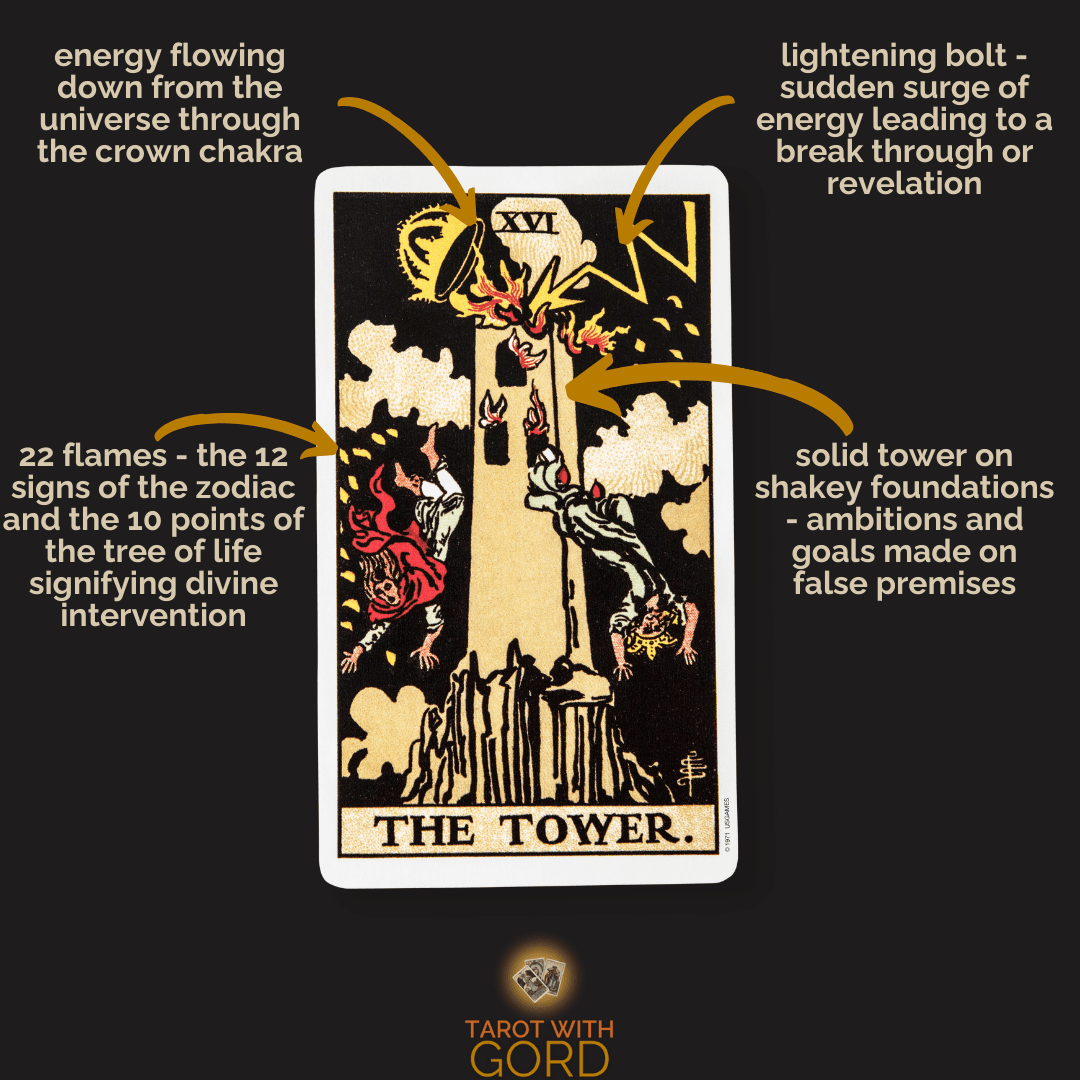 The Tower is one of the cards on the Fool’s Journey, a symbolic narrative in tarot that explores the archetypes and experiences shaping our existence. The Major Arcana represents the grand themes and life-altering moments in the tarot. It’s a 22-card journey that begins with the Fool, symbolising new beginnings and adventure. Each card represents a distinct chapter, exploring the dualities, challenges, and transformations we face throughout our lives.