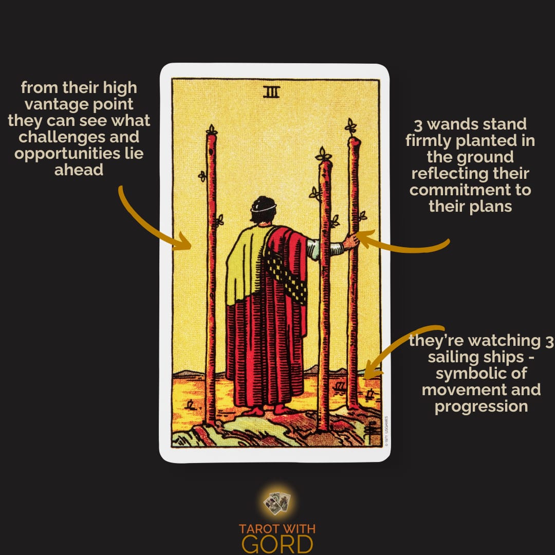 In the Rider-Waite-Smith Three of Wands, a figure stands on a cliff overlooking the sea, watching ships sail into the distance. Three tall wands are planted beside and behind them. The figure’s back is to us as they gaze outward toward the horizon and distant mountains.