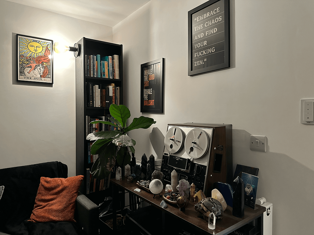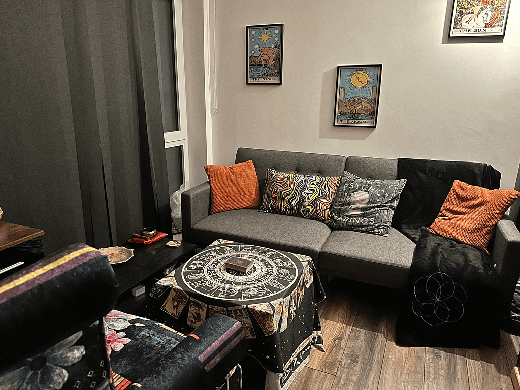 There’s no waiting room, so I ask that you arrive bang on time. This isn’t a clinic or a café, it’s my home. When you step inside, we head straight into the tarot reading room: think cosy lighting, soft music, the smell of essential oils in the diffuser, and a space filled with crystals, tarot prints, books, and instruments. The sofa’s comfy, the tea’s hot, and the energy is dialled into you. I’ve created this space to be calming and focused, perfect for deep dives, big feelings, or just needing a bit of space to think.