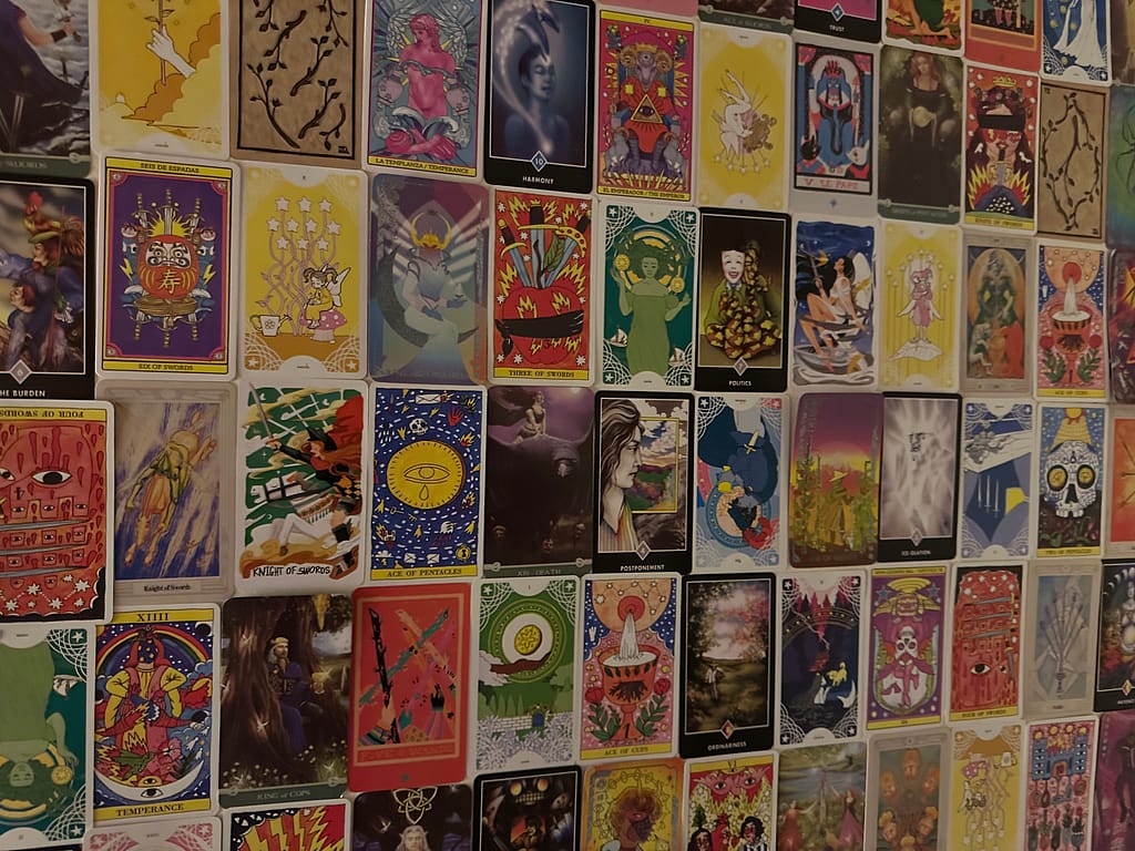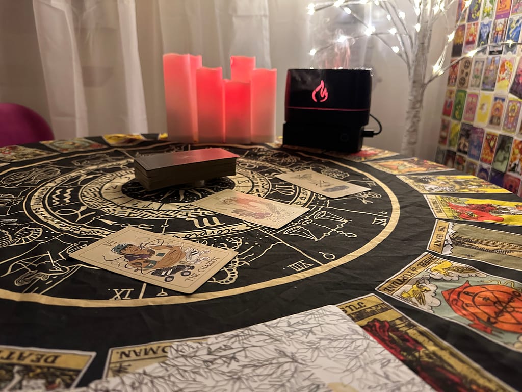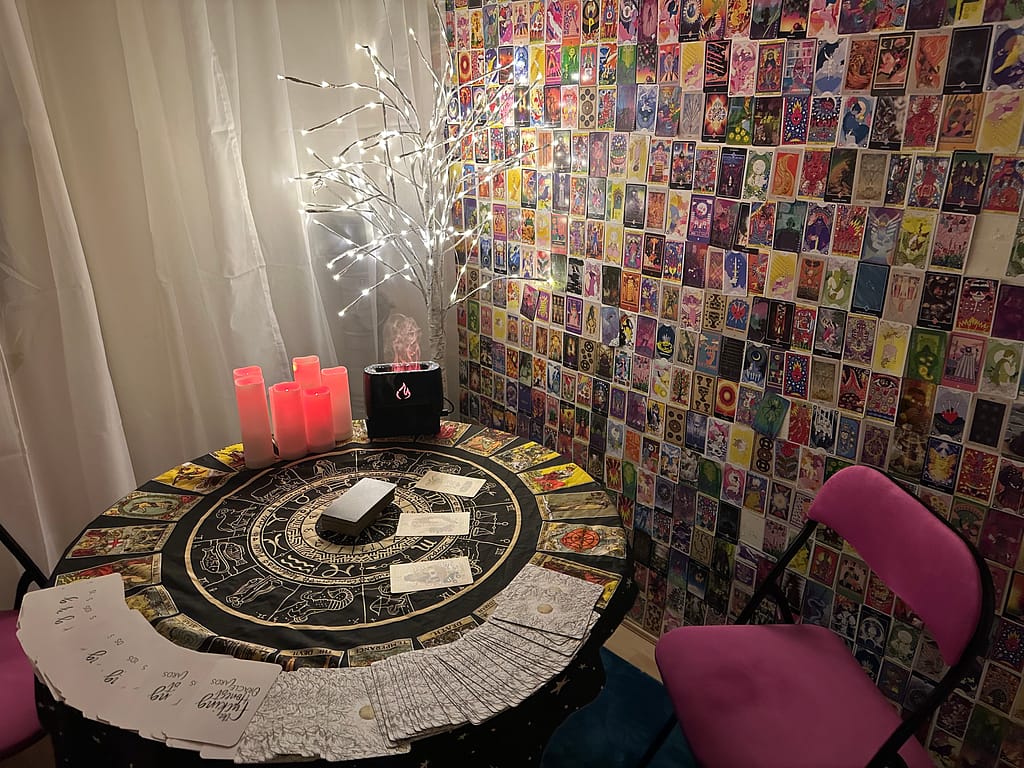 The room itself? Absolute vibe. There are over a thousand tarot cards stuck to the walls, soft lighting, calming tunes, a fake ivy ceiling with roses, and essential oils floating in the air. There’s a nice big table, my signature tablecloth, a couple of chairs, and always a selection of oracle decks for that finishing touch. It’s visually stunning but still grounded, just the right mix of magic and real life.