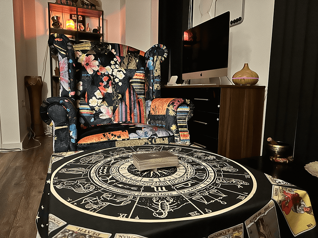 The room itself? Absolute vibe. There are over a thousand tarot cards stuck to the walls, soft lighting, calming tunes, a fake ivy ceiling with roses, and essential oils floating in the air. There’s a nice big table, my signature tablecloth, a couple of chairs, and always a selection of oracle decks for that finishing touch. It’s visually stunning but still grounded, just the right mix of magic and real life.