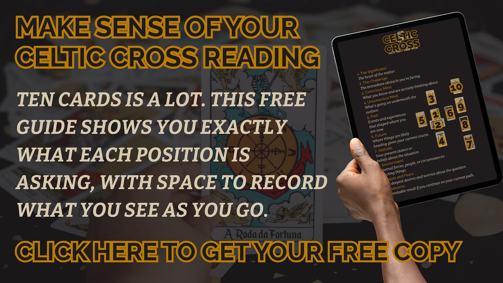 The free guide gives you the Celtic Cross spread with position descriptions and space to note down your cards and your initial reflections.