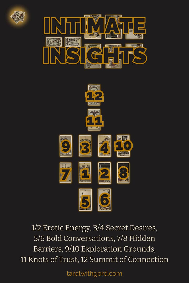 The Intimate Insights spread uses twelve cards. Each position looks at a different aspect of your sexual connection: your desires, your partner’s desires, your shared energy, boundaries, trust, communication, blocks, healing, advice and potential outcome. This depth offers a holistic understanding of your compatibility.