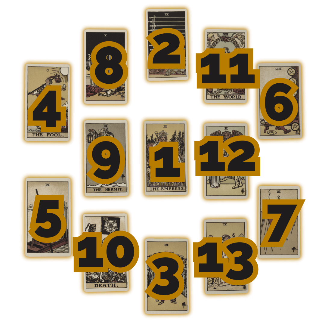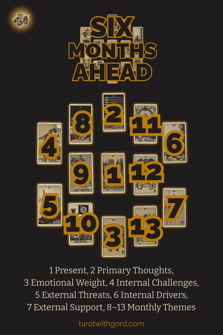 This thirteen card six month tarot spread offers a month‑by‑month overview of the next half year. It reveals underlying currents, external influences and internal drivers so you can plan wisely. Use it to map themes, highlight opportunities and navigate challenges with intention.