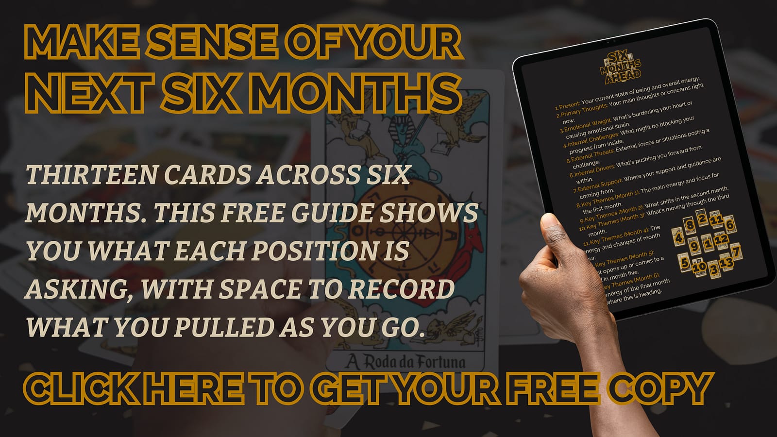 The free guide gives you the Six Months Ahead spread with position descriptions and space to note down your cards and your initial reflections.